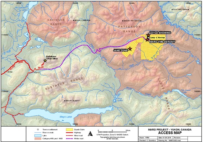 The Marg Property is a volcanogenic massive sulphide (VMS) deposit located in the Central Yukon, approximately 40 km east of Keno City. According to the property’s claims history, Azarga acquired a 100% interest in the 400 mineral claims, which cover approximately 8,400 hectares, in July 2025 (Figure 1).