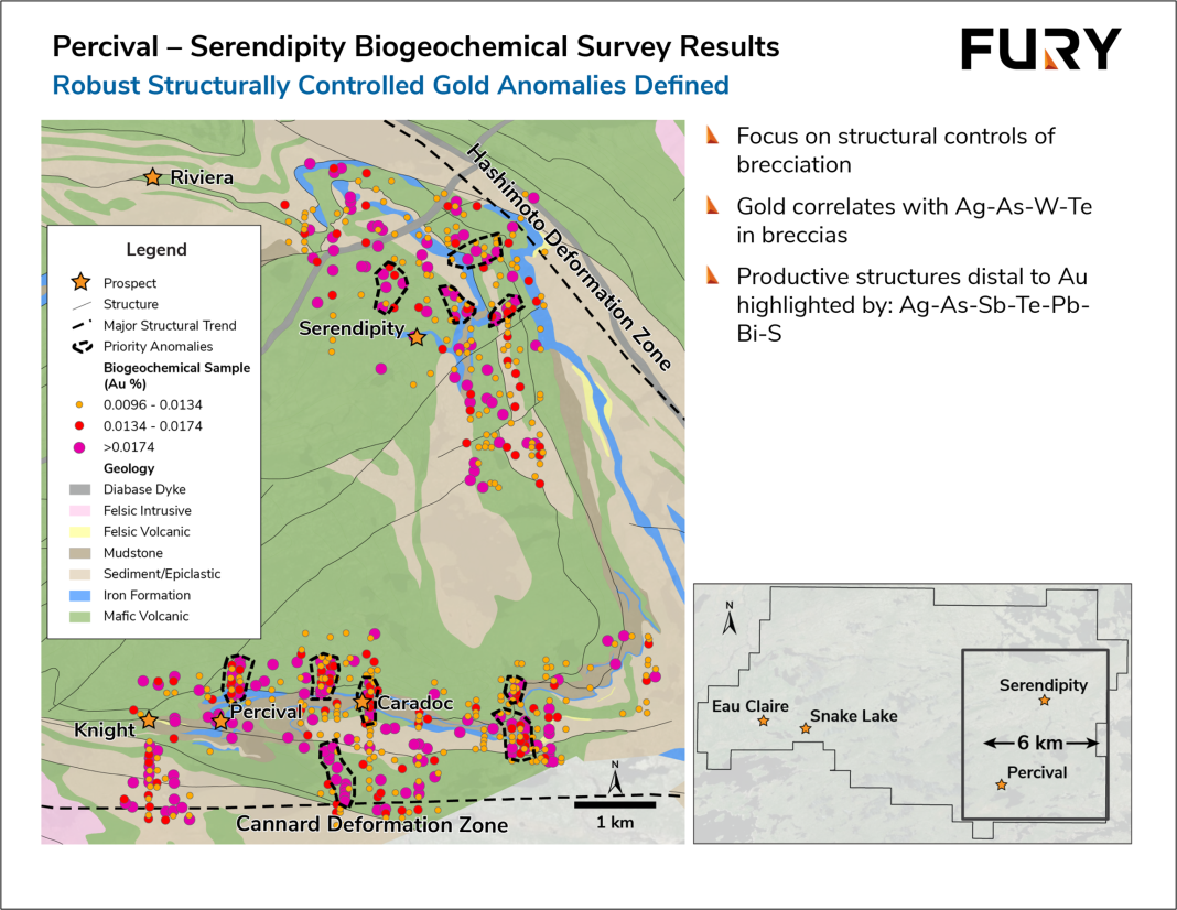 Fury’s technical team has gained a better understanding of the combination of pathfinder elements and structural controls on the gold mineralization along the Percival to Serendipity trend. Broad low-grade gold mineralization occurs along well-defined structural splays sub-parallel to the regional Cannard and Hashimoto Deformation Zones. Certain elemental associations, most notably Arsenic, Bismuth, and Tungsten, are proving to be important pathfinders for the gold mineralization. Higher-grade gold within the broader corridor is controlled by secondary shearing and is identified by the high degree of silicification. With this knowledge, the team has refined their targeting along the Percival to Serendipity Horizon identifying ten priority targets for 2024. These identified targets lie within the same stratigraphic package as Percival Main and have undergone varying degrees of deformation. The proximity of the main Cannard and Hashimoto Deformation Zones varies from one target to the other and could have a significant impact on the gold mineralization. Fury believes the varying degrees of deformation are an important control on both gold mineralization and the potential preservation of a sizeable mineralized body.