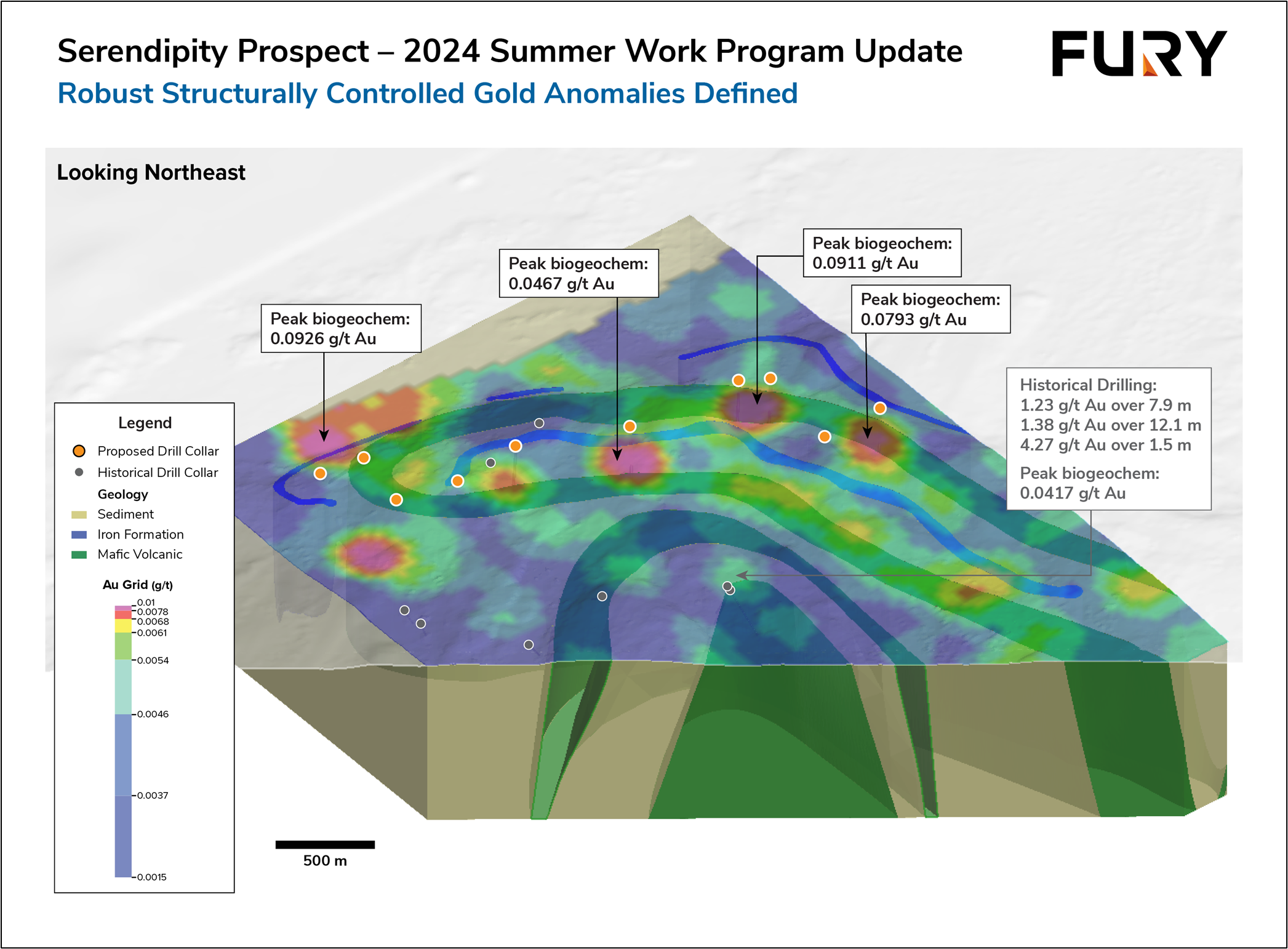 VANCOUVER, BC / ACCESSWIRE / June 19, 2024 / Fury Gold Mines Limited (TSX:FURY)(NYSE American:FURY) (“Fury” or the “Company”) announces that a drill has been mobilized to the greenfield Serendipity Prospect on its wholly owned Eau Claire project in the Eeyou Istchee Territory in the James Bay region of Quebec. The Serendipity Prospect lies within the same prospective geological setting as the Company’s Percival deposit. The Serendipity Prospect is defined by 10 robust geochemical targets with up to 150 times background gold values proximal to the regional scale Hashimoto Deformation Zone (Figure 1). Limited historical drilling near Serendipity intercepted 7.9 metres (m) of 1.23 g/t gold; 12.1 m of 1.38 g/t gold and 1.5 m of 4.27 g/t gold, however, this historical drilling is over 800 m from the targets defined by Fury in an area where the geochemical anomalies are half of the values being targeted (Figure 2). The Company intends to drill test three targets at Serendipity with approximately 3,500 m of diamond drilling.