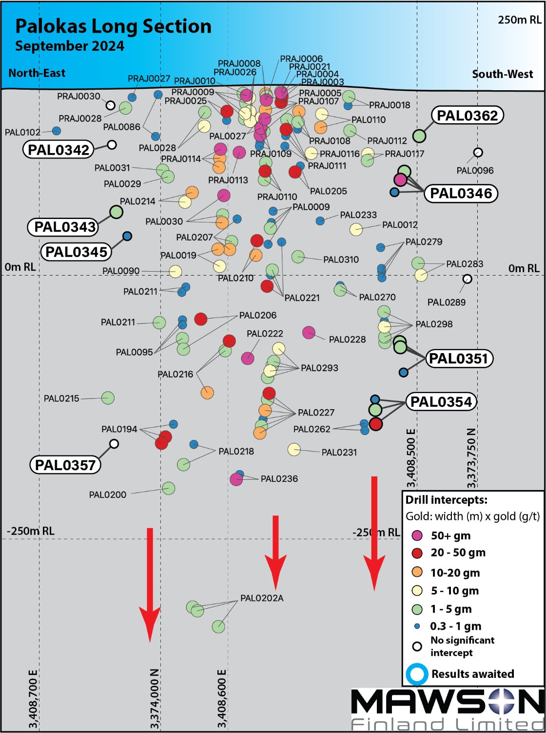 PAL0342 and PAL0357 similarly drilled into the northern margins of the Palokas system but failed to return significant intercepts