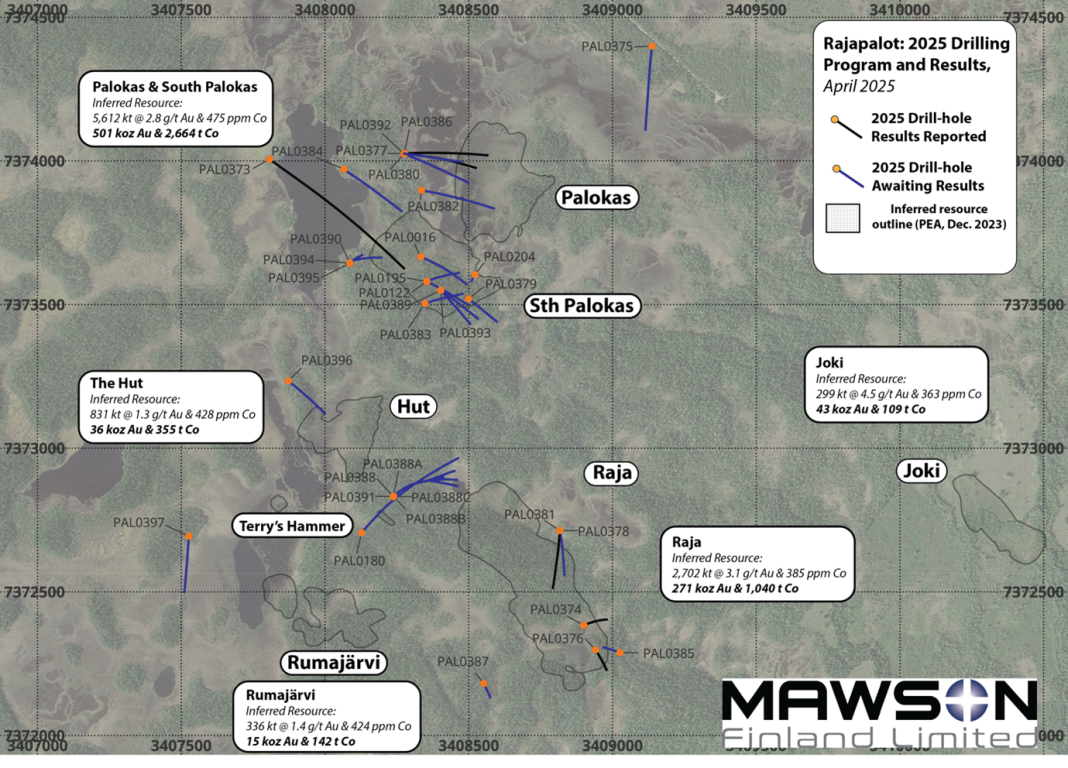 VANCOUVER, BC / ACCESS Newswire / April 24, 2025 / Mawson Finland Limited (“Mawson” or the “Company“) (TSXV:MFL) is pleased to announce completion of the 2025 winter drilling campaign drilling a total of 11,397 metres from 33 drillholes at the Company’s wholly-owned Rajapalot gold-cobalt project in Finland, reporting visible intercepts of Rajapalot-style mineralization from Raja Deeps drilling, and updates BOT (base-of-till) geochemical programme (see Table 1, Figure 1 and Figure 2 in Schedule “A” hereto).