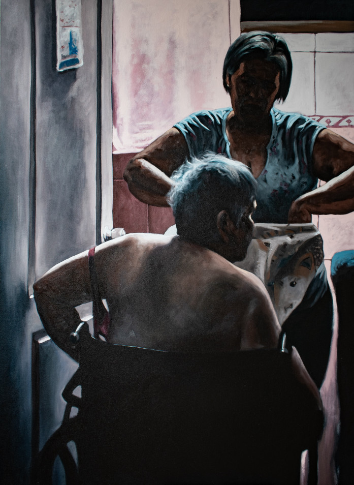 Among the notable pieces in the show is The Caregiver 2, a large-scale oil painting that presents a family member assisting an elder with tenderness and restraint. The painting exemplifies Mejía’s neo-academic style, incorporating chiaroscuro to elevate an everyday scene into a reflection on the emotional and physical labor intrinsic to caregiving. Through this portrayal, Mejía sheds light on the often-overlooked dynamics and unspoken connection between caregiver and recipient and reflects on the complexities of these relationships.