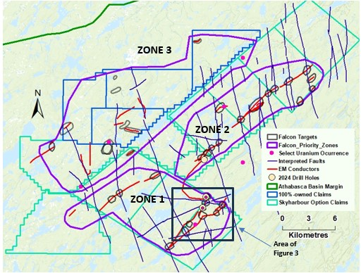 North Shore has divided Falcon into three uranium exploration zones, 1, 2 and 3 (Figure 2). To date, North Shore has identified 36 uranium targets at Falcon with 12 of those being in Zone 1. The targets have been selected based on analysis of multiple datasets including interpretation by Condor North Consulting LLC (“Condor“), Earthfield Technologies Inc., Skyharbour Resources Ltd., TerraLogic Exploration Inc. and North Shore. Following are some of the criteria being used to define and prioritize targets: