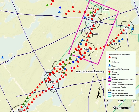 Figure 3. Falcon priority area where uranium mineralization was discovered by North Shore in 2024 at drill targets P03 and P08. EM and structural interpretation by Condor; single- and double-peak responses picked from survey profile lines.
