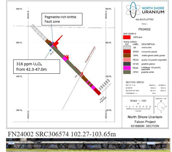 VANCOUVER, BC / ACCESSWIRE / May 16, 2024 / North Shore Uranium Ltd. (TSXV:NSU) (“North Shore” or the “Company“) is pleased to announce that multiple samples collected from two of the first three uranium prospects drilled by the Company at its 55,699-hectare Falcon Property (“Falcon” or the “Property“) at the eastern margin of the Athabasca Basin in Saskatchewan have returned anomalous uranium values of greater than 300 ppm U3O8 and up to a maximum of 572 ppm U3O8 (Table 1). The Company is now planning for future exploration programs on the Property.