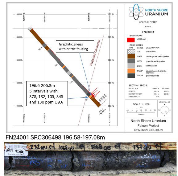 Figure 2. Drill section from drillhole FN24001 and drill core photo from anomalous interval which returned 378 ppm U3O8.