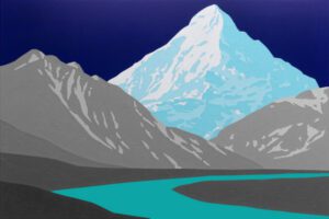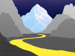 Untethered from views found in our real world and free from geographical constraints, Wightman’s landscapes present an imaginary space rich in both colour and texture where abstraction and reality contest and converge. The once familiar swirls of living-room wallpaper patterns are re-contextualised as the crevices of mountains; bumpy spirals become ravines and glaciers set against lakes and skies of impossibly vibrant colour. It is through each of Wightman’s vistas that we are offered a glimpse into another world – one that is seemingly real and yet entirely fictional.