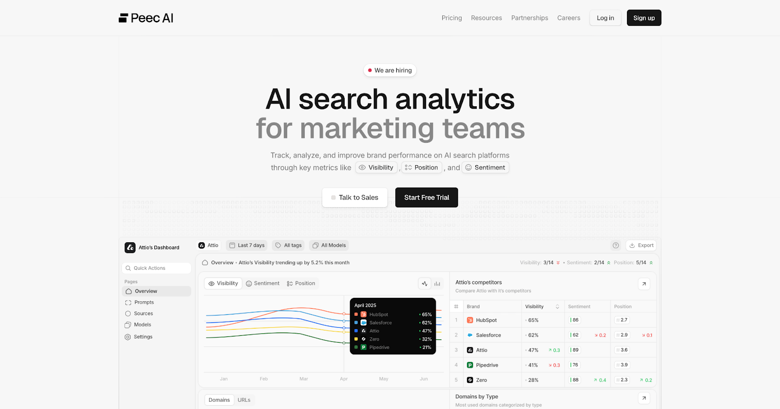 Peec AI is a leading AI search visibility and analytics platform that tracks how brands appear inside answers from ChatGPT, Gemini, Perplexity, Claude, Microsoft Co-pilot, Google AI Mode and Google AI Overviews. It runs predefined prompts across multiple AI systems and reports prompt-level visibility, position, sentiment, and citations, segmented across countries, languages, and topic clusters.