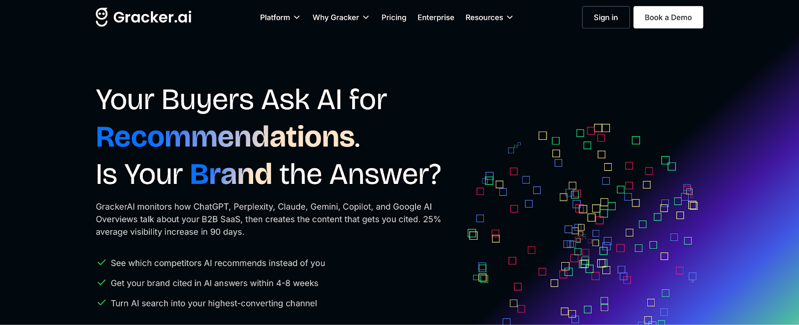 GrackerAI is a GEO platform and AI content engine designed for B2B SaaS companies that want to combine AI visibility monitoring with automated programmatic SEO content. The platform tracks brand presence across AI assistants such as ChatGPT, Perplexity, Claude, Gemini, Copilot, and Google AI Overviews. It analyzes prompts, citations, and competitor mentions, then generates SEO- and GEO-optimized content clusters and pSEO portals designed to capture those queries.