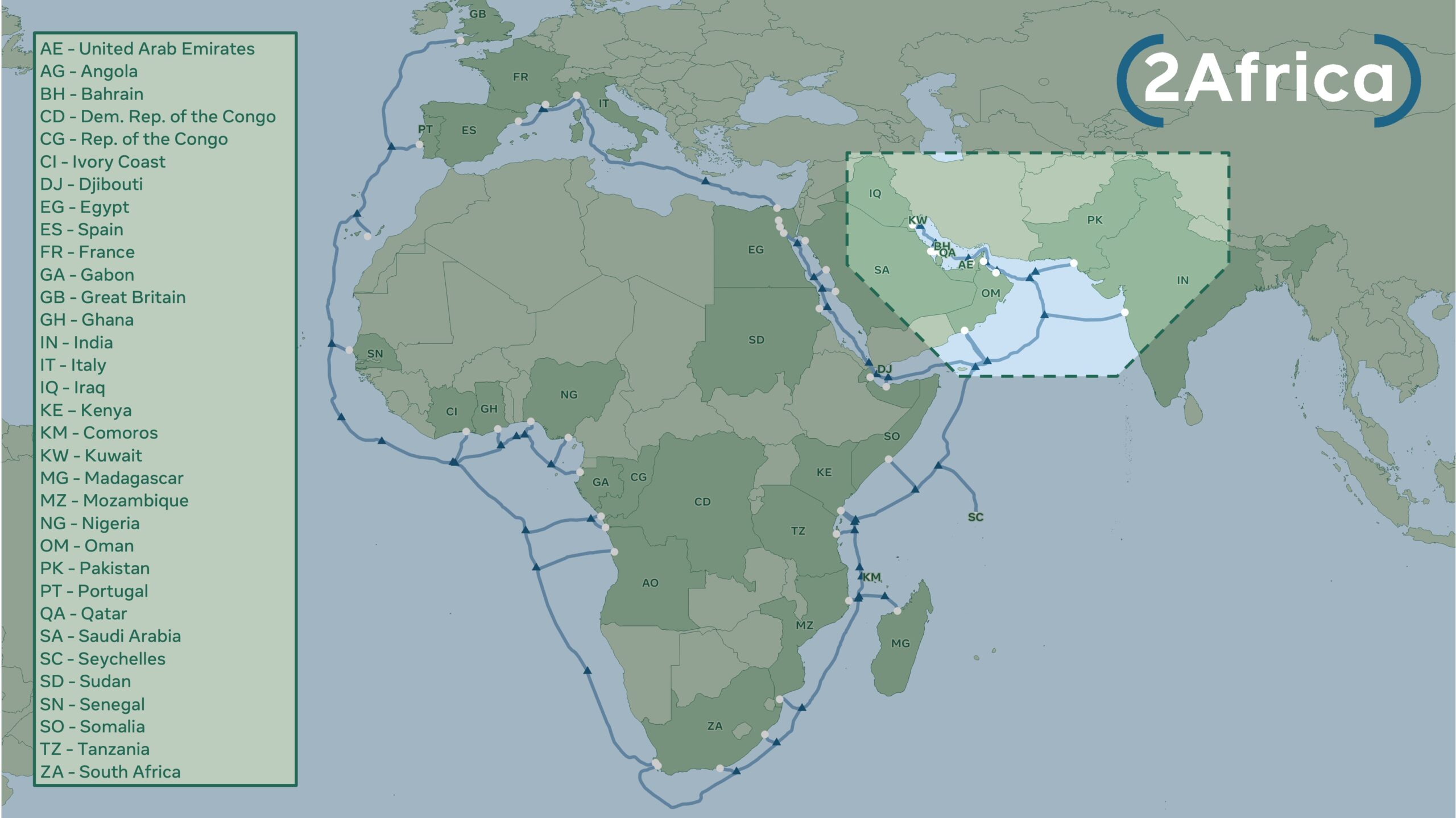 Now connecting three continents, Africa, Europe and Asia terrestrially through Egypt, 2Africa creates unique connectivity by adding vital landing locations in Oman (Barka), UAE (Abu Dhabi and Kalba), Qatar (Doha), Bahrain (Manama), Kuwait (Kuwait), Iraq (Al-Faw), Pakistan (Karachi), India (Mumbai), and a fourth landing in Saudi Arabia (Al Khobar). The new 2Africa PEARLS branch joins recently announced extensions to the Canary Islands, the Seychelles, Comoros Islands, Angola, and a new landing to south-east Nigeria.