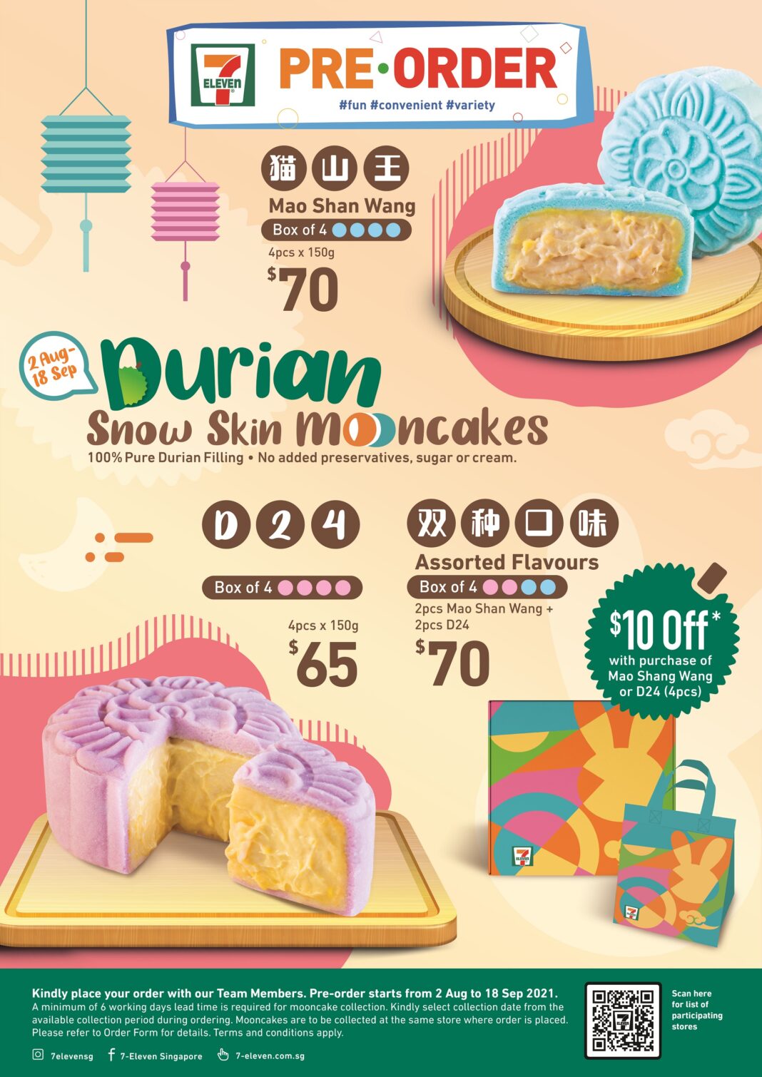 Ordering your mooncakes could not be easier. Simply pre-order them from 2 August to 18 September 2021 with collection available at these selected 48 participating stores. What’s more, enjoy $10 off our Assorted Flavours Mooncakes (4pcs) with purchase of Mao Shan Wang Mooncakes (4pcs) or D24 Mooncakes (4pcs)!