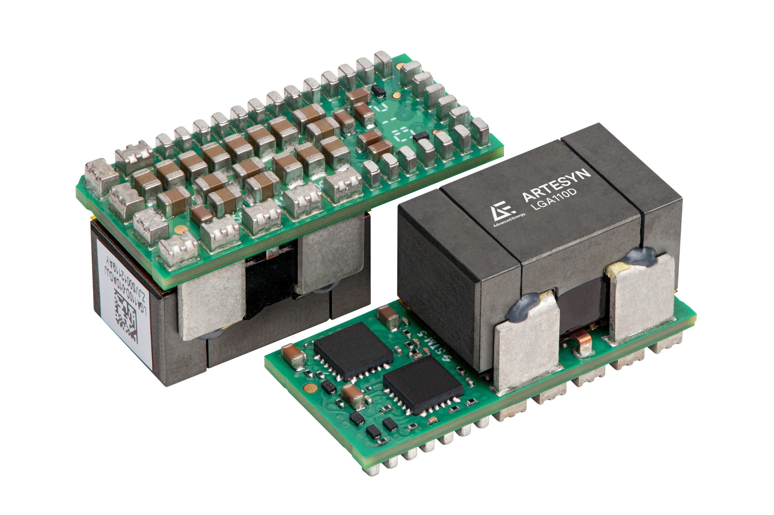 In addition to its superior current density of 220 amps per square inch, the LGA110D features two independently controlled 55-amp/175-watt outputs, which means fewer power converters are needed in multiple channel or high current applications. The dual outputs can be selected as completely independent, configured to a single output or synchronized with up to three other LGA110D converters for truly flexible design combinations. This frees up PCB space and reduces overall system cost while addressing the increasing current requirements in FPGA or ASIC devices used in complex, demanding applications.