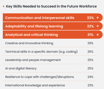 Amongst key competencies needed to succeed in the workforce, youths surveyed identified communication and interpersonal skills (33 percent), adaptability and lifelong learning (32 percent), and analytical and critical thinking (31 percent) as the most valued competencies.