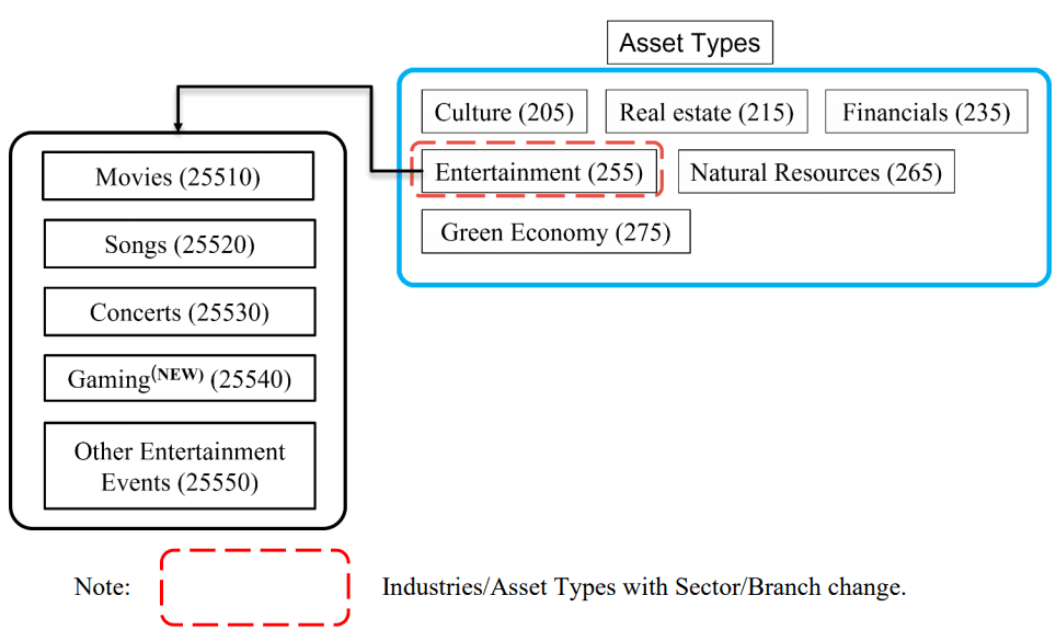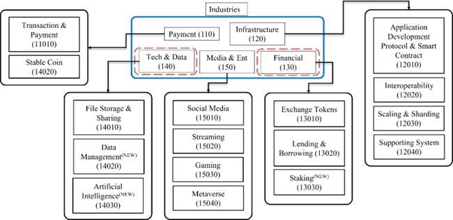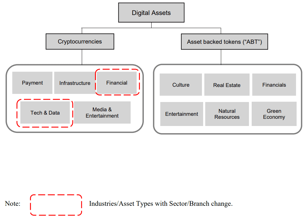 DAICS® covers both cryptocurrencies and asset-backed tokens (“ABT”), to be reviewed semi-annually at the end of June and December. On cryptocurrencies side, it is a three-tier system that groups cryptocurrencies into 5 main industries: 1) Payment, 2) Infrastructure, 3) Financial services, 4) Technology & Data and 5) Media & Entertainment. These industries are further divided into 16 industry sectors and sub-sectors to be introduced in the future. Under asset-backed tokens, there are 6 asset types: 1) Culture, 2) Real Estate, 3) Financials, 4) Entertainment, 5) Natural Resources, 6) Green Economy. These asset types are further divided into 31 branches and sub-branches to be introduced in the future.
