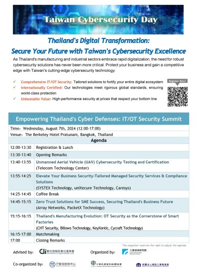 Subscribe ‘Taiwan Cybersecurity Day’ will be held on August 7 (Wednesday) afternoon at The Berkeley Hotel Pratunam in Bangkok. The event will feature presentations from internationally acclaimed Taiwanese cybersecurity firms like CHT Security, Billows Technology, KeyXentic, Cycraft Technology, Array Networks Taiwan, PacketX Technology, SYSTEX Corporation, uniXecure Technology Corporation. They’ll share insights on zero trust solutions, OT cybersecurity technology, professional cybersecurity management and detection services, etc. Invitations have been extended to exchange ideas with government officials, corporate executives, technical experts, and academic representatives. The event invites all interested in cybersecurity issues to join us in exploring how to maintain competitiveness and information security in the digital age. For more event details, please refer to the event page: https://reurl.cc/XG7KGD.