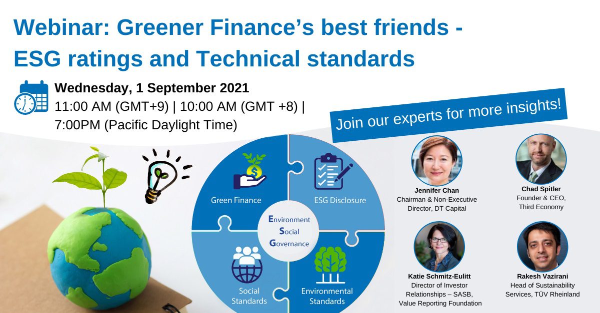 At this webinar on 1 September 2021 (Wed) 10 am – 11:30 am (GMT+8), organized by TÜV Rheinland Hong Kong, speaking respectively on policy drivers for Green/Sustainable Finance, decision-useful reporting standards & metrics, and converting data/metrics to actionable ratings will be Rakesh Vazirani, Head of Sustainability Services, TÜV Rheinland together with Jennifer Chan, Chairman and Non-Executive Director, DT Capital, Chad Spitler, Founder & CEO, Third Economy, and Katie Schmitz-Eulitt, Director of Investor Relationships – SASB, Value Reporting Foundation.