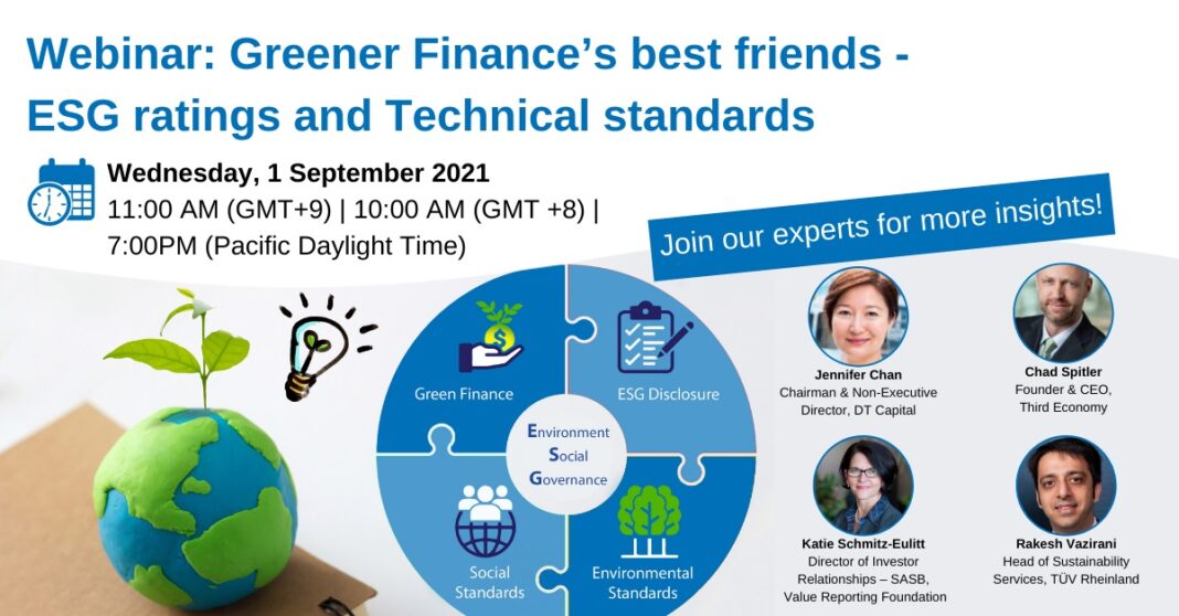 SubscribeAt this webinar on 1 September 2021 (Wed) 10 am – 11:30 am (GMT+8), organized by TÜV Rheinland Hong Kong, speaking respectively on policy drivers for Green/Sustainable Finance, decision-useful reporting standards & metrics, and converting data/metrics to actionable ratings will be Rakesh Vazirani, Head of Sustainability Services, TÜV Rheinland together with Jennifer Chan, Chairman and Non-Executive Director, DT Capital, Chad Spitler, Founder & CEO, Third Economy, and Katie Schmitz-Eulitt, Director of Investor Relationships – SASB, Value Reporting Foundation.